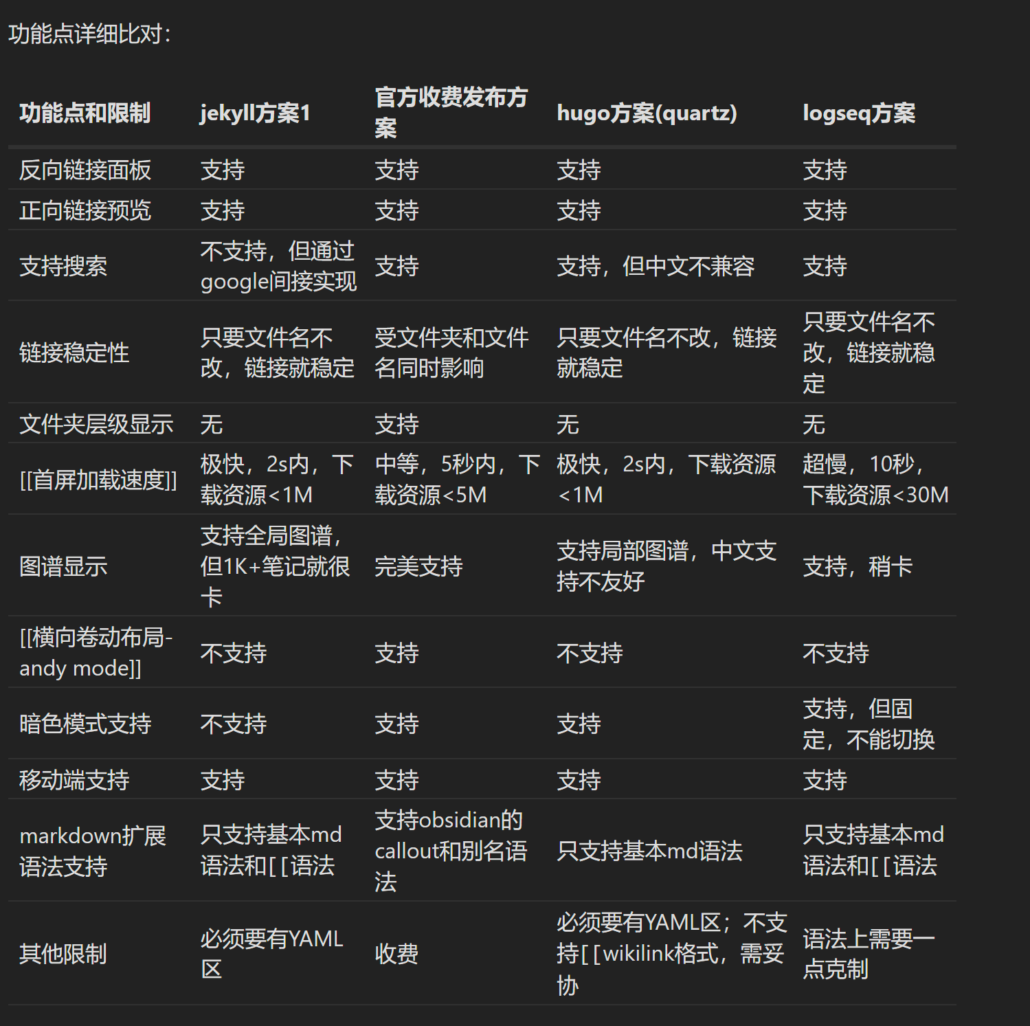 这里使用方案是,基于 Markdown 文件,使用 Obsidian 作为编辑器,利用开源 Obsidian 解析框架 Quartz 进行 Markdown 博客发布。 引用一下 obsidian 目前最完美的免费发布方案 - 渐进式教程 - 经验分享 - Obsidian 中文论坛 分析的 Obsidian 发布方案比对: