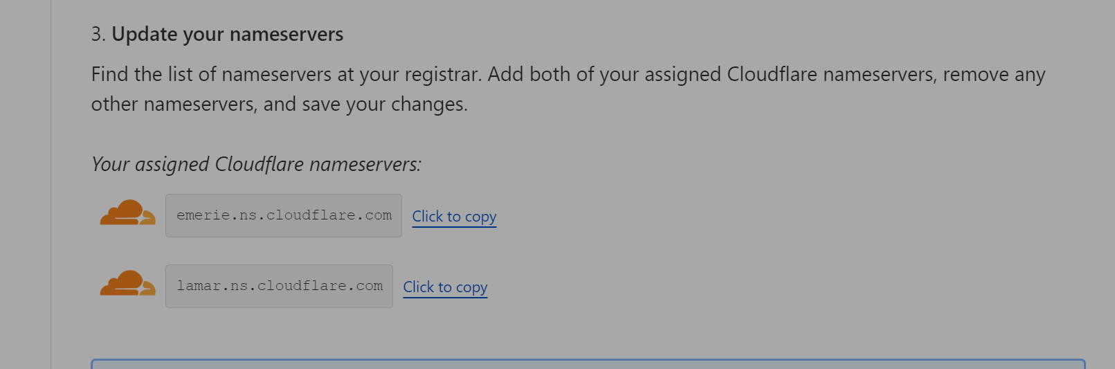 然后到了 Change your nameservers DNS 解析配置页面, 这一步很关键,要记录下 Cloudflare的 DNS解析服务器。