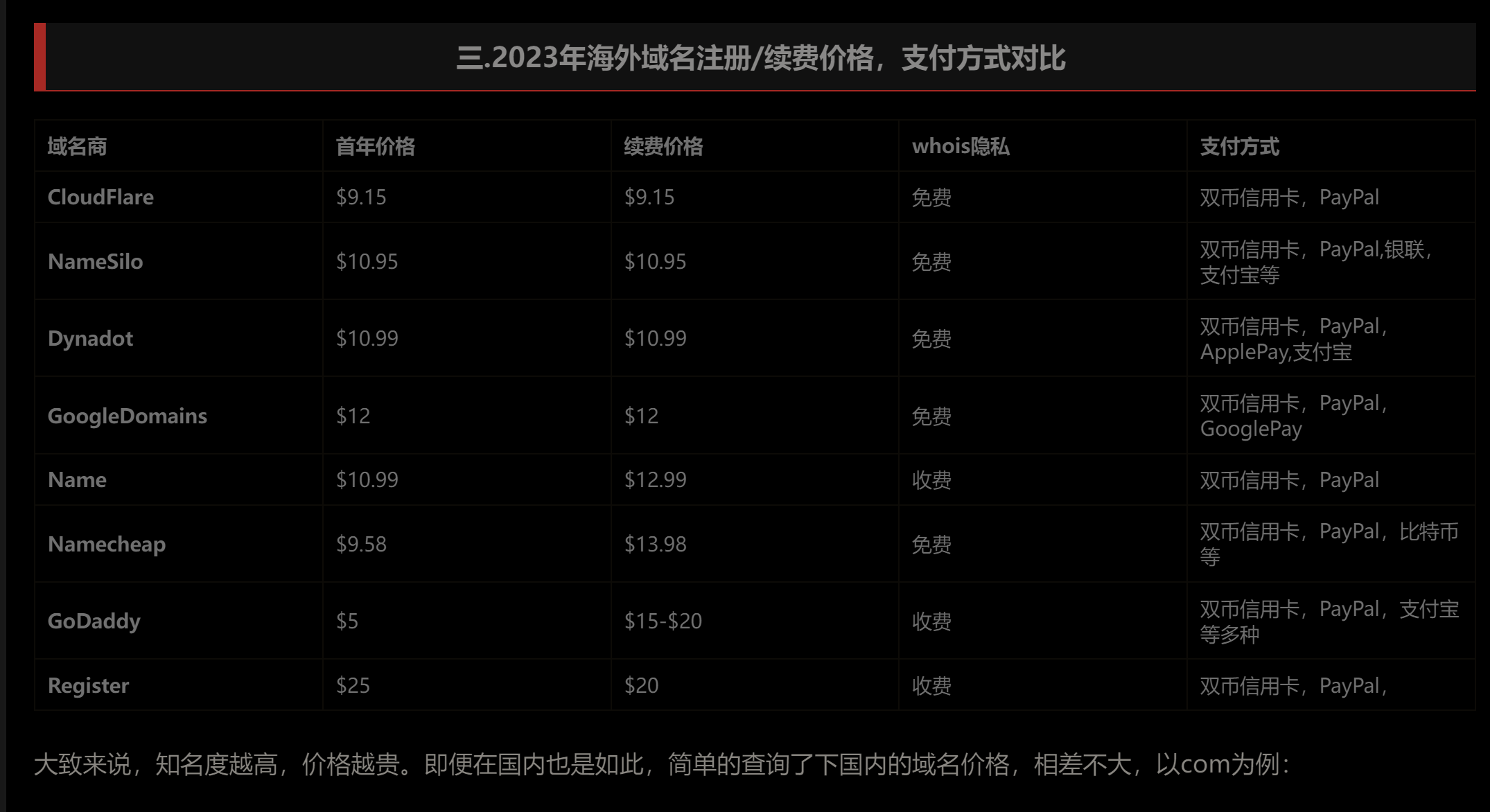 如果想要获取域名,需要从域名提供商那里获得,以前有免费的域名,现在免费的不大好找,至于选择哪个服务体提供商, 这里引用 2023国内和国外域名平台对比,及注册优惠购买介绍 |远山外贸笔记 的两张图,自行选择适合自己需求的即可。